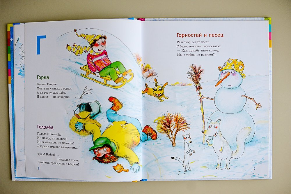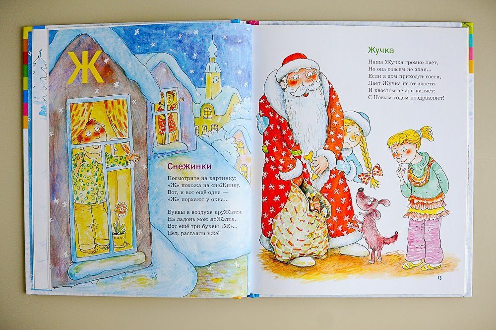 Это одна из лучших детских азбук в нашей коллекции! Стихи Андрея Усачева будто живые. Их читаешь, и на душе становится хорошо, хочется жить и идти вперед - учить буквы, валяться в сугробах, наряжать елку. Хочется смеяться и кататься с горки. Вдобавок картинки, иллюстрирующие книгу, подходят к ней как нельзя кстати. Они такие же симпатичные и беззаботные, и от них так же легко становится на душе. На мой взгляд, это отличный вариант подарка друзьям или себе любимым. Ведь что мы имеем под обложкой? По сути, четыре в одном! Тематичная книжка про новый год - рраз, добрые и с юмором написанные стихи талантливого писателя - два; задорные под стать им иллюстрации - три, и плюс присутствует обучающий элемент в виде той самой азбуки - четыре. Ну, ведь здорово, правда?..
