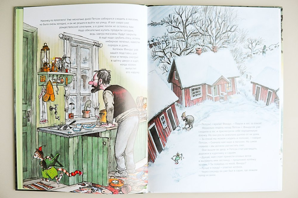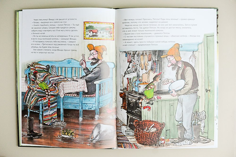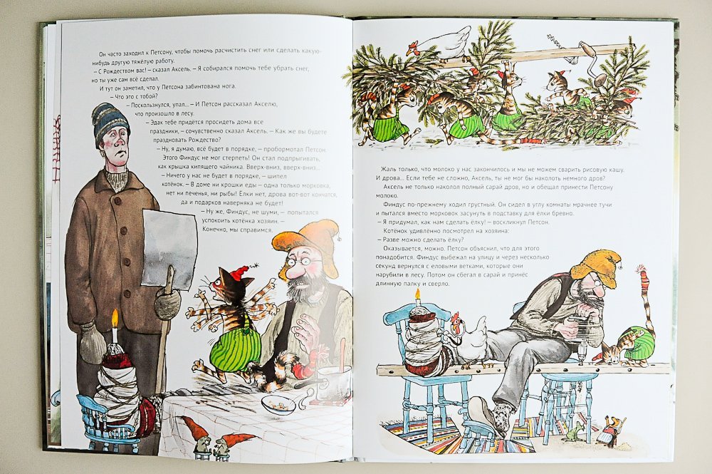 «Прекрасное, богато иллюстрированное детское повествование расскажет о небольших приключениях двух друзей» - именно так начинается отзыв об этой книге на Лабиринте. И действительно, картинки там и правда «богатые» - талантливо исполненные, с большим количеством мелких деталей они присутствуют на каждом развороте, отчего книгу тянет даже больше рассматривать, нежели читать. Свен Нурдквист сам иллюстрирует все свои рассказы и делает это с большой любовью. Вероятно, именно поэтому серия с Финдусом и Петсоном так популярна среди маленьких читателей - если верить отзывам с того же Лабиринта.