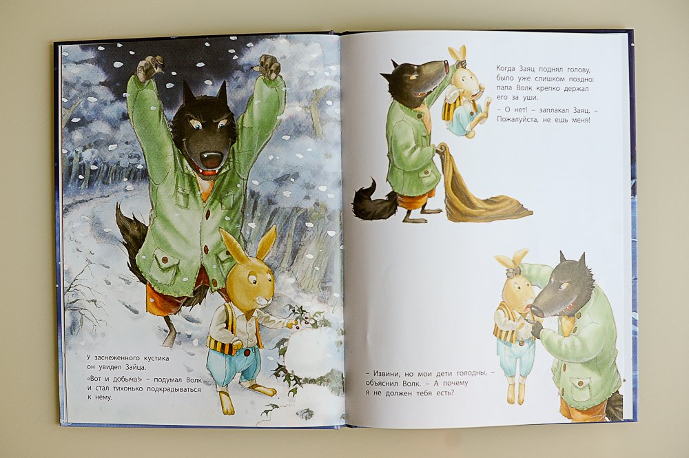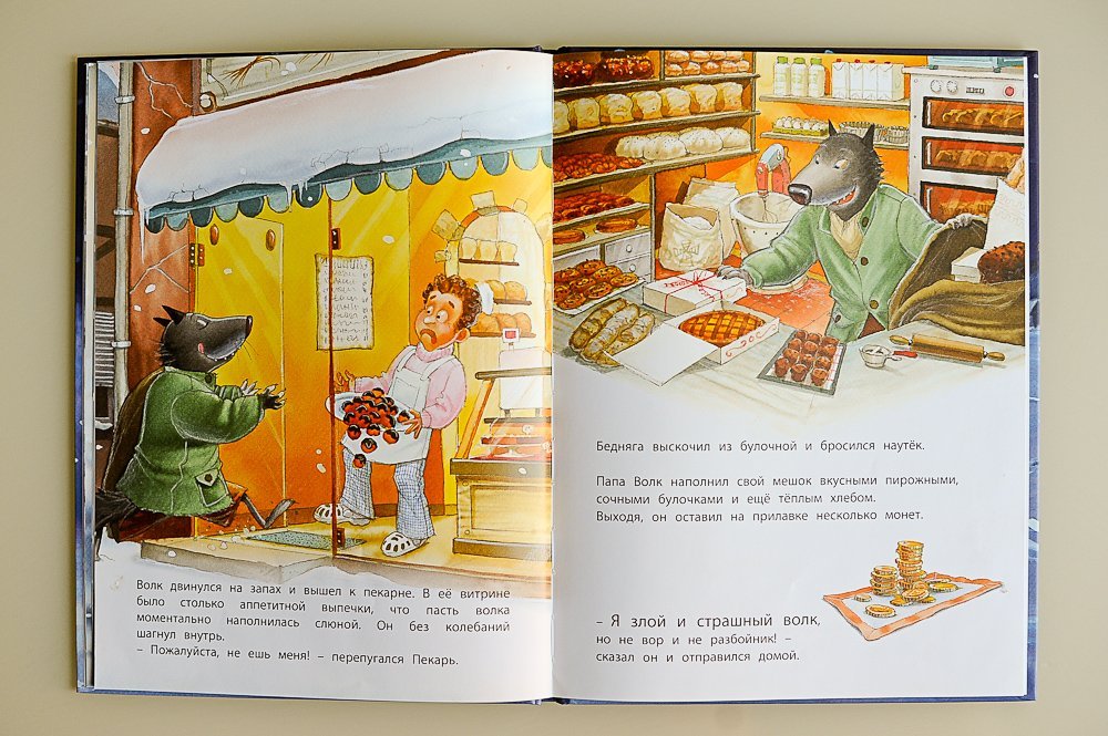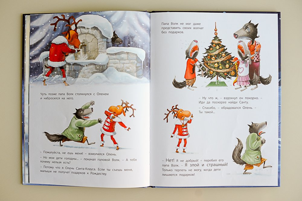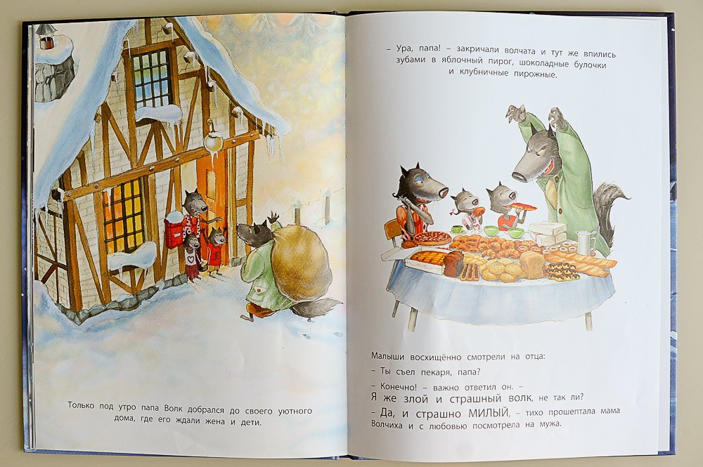 Любимая и зачитанная в прошлом году история про волка и его похождения в рождественскую ночь. Прекрасное качество печати, достаточно простой и в то же время не простецкий слог. Картинок много и они все очень сочные, красочные, слегка мультяшные - в хорошем смысле этого слова. Ну и главный герой, волк, обрисован очень хорошо, и мне напомнил нашего волка, который, помните, сжалился над теленком и не стал его есть, а оставил себе и заботился о нем, пока тот не подрастет… Только наш постарше и более потрепан, а этот в самом расцвете сил, упитанный, видно, что ему хорошо живется со своими волчатами и супругой с подкрашенными ресничками, томно называющей его «милым».