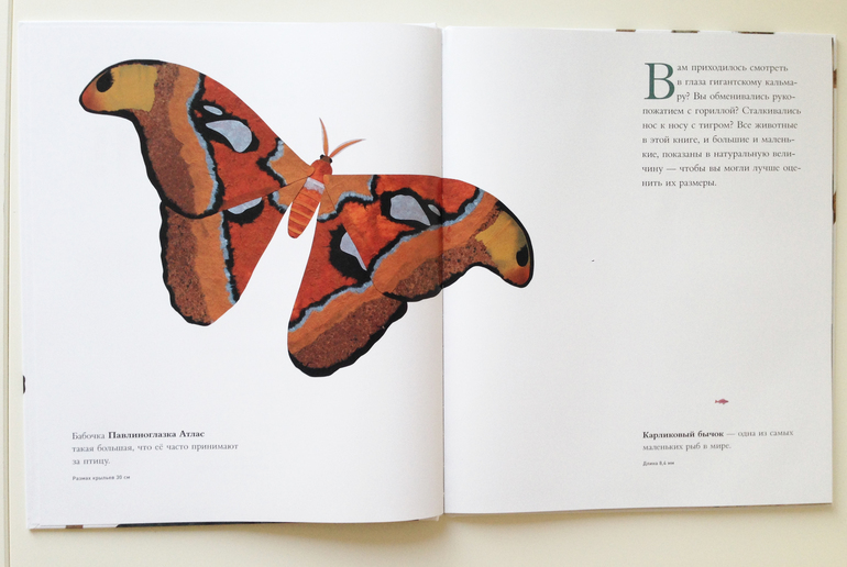 Животные в книжке подобраны по принципу контрастов и зрелищности. Не даром она называется "Сравни". Но основной акцент автор сделал на неожиданно гигантских, тяжёлых и длинных животных. На одном развороте мы заглядываем в пасть огромной белой акуле,а на следующем уже сравниваем лапу гориллы и карликового мышиного лемура, который весь размером с большой палец вышеупомянутого примата. Просто супер! Бац - перед нами какой-то громный круг: оказывается это глаз гигантского кальмара,