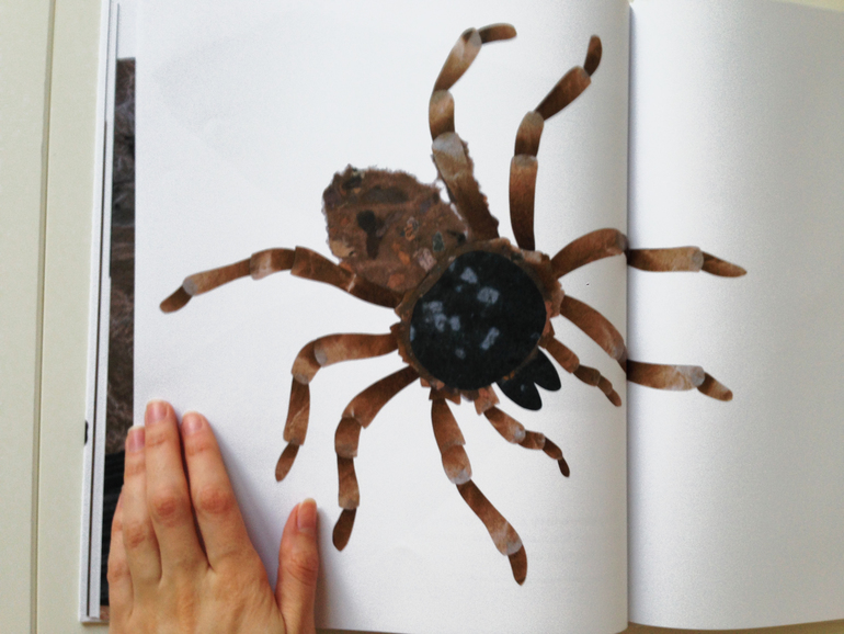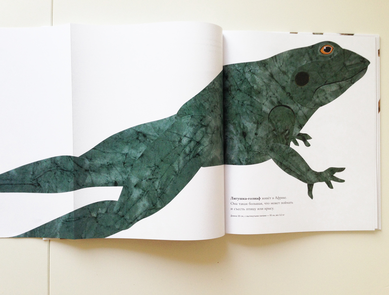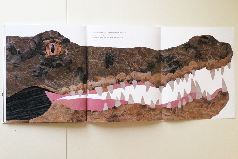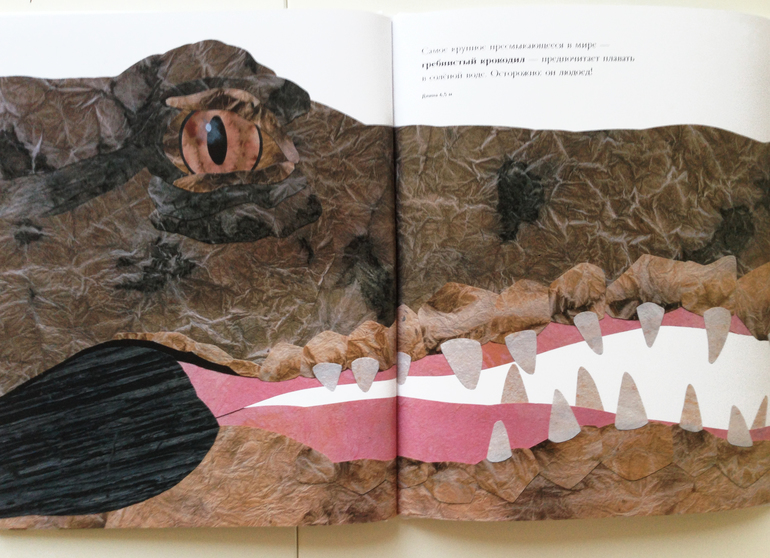 Итак! Сегодняшний экспонат с изюминкой, которая меня покорила: все персонажи в реальную величину. То есть, если перед нами амурский тигр, а, ясное дело, он весь в книгу не влезет, то мы видим лишь кусок его морды. Морды нарисованной, ( в данном случае это коллаж) в натуральную величину! Мне эта затея понравилась и показалась весьма-весьма интересной.