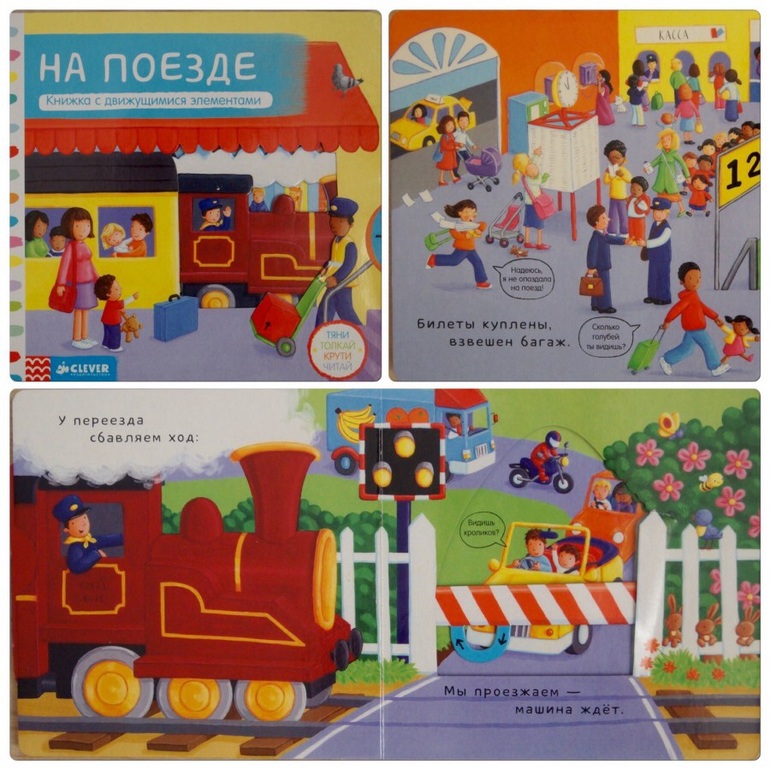 Движущиеся механизмы способствуют развитию мелкой моторики, а приятные иллюстрации позволяют придумывать различные истории на тему путешествий на поезде.