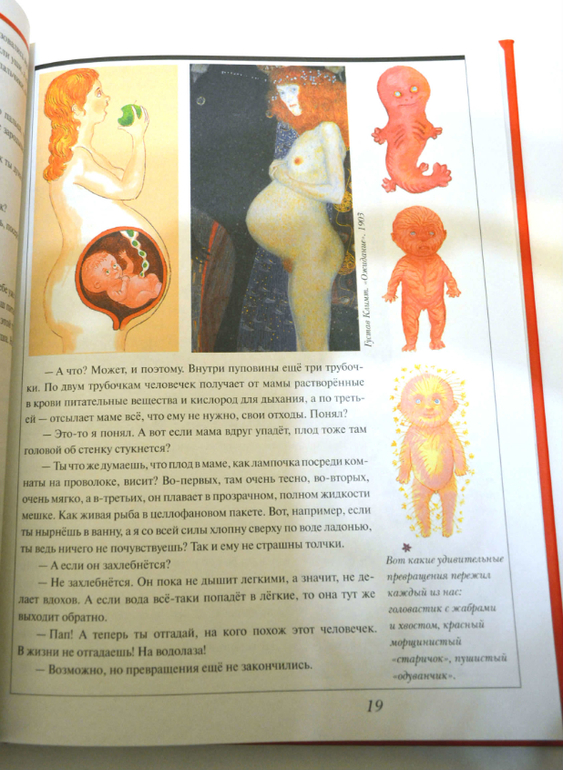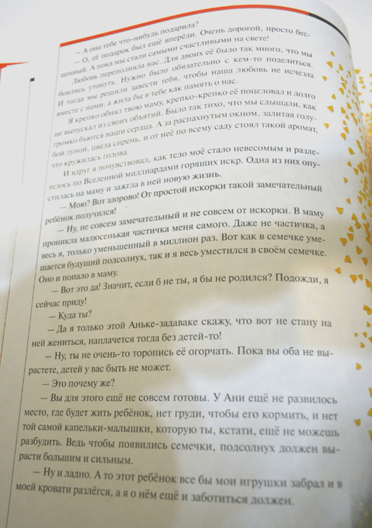 Текст в книге построен в виде диалога папы и сына, очень интересно написано, с тонким чувством юмора, очень грамотно, без пошлости, без вульгарности, тут более подробно рассказано о моменте рождения чем в первой книге, поэтому я бы её отнесла к возрасту от 7 - 8 лет, хотя тут и нет интимных подробностей, но всё же.