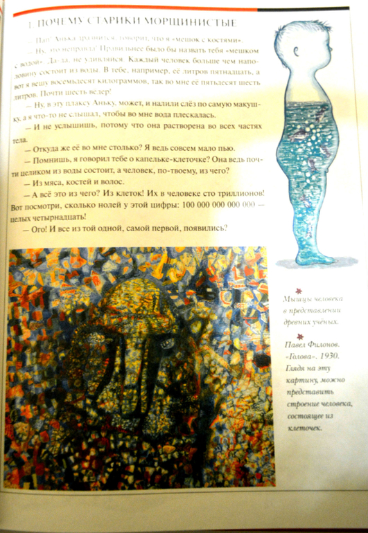 Всё написано в виде увлекательных рассказов, к примеру кровяные тельца в книге сравниваются с кораблями, эритроциты это торговые лодки, везущие ценный груз, а лейкоциты - военные суда, охраняющие их, так легко это запомнить, особенно если обыграть всё это с ребёнком!