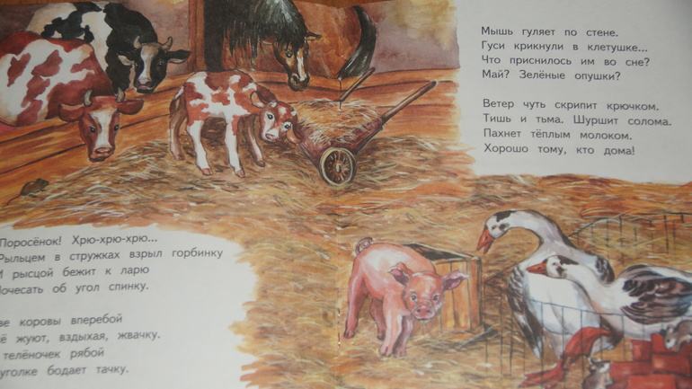 А еще с животными в хлеву: корова, лошадь, гуси, несмышленые детеныши: поросенок и жеребенок. Мне кажется, я даже запах этого хлева слышу...