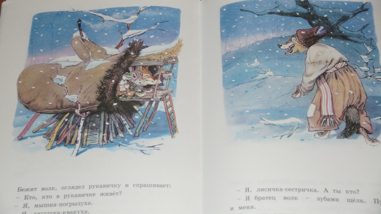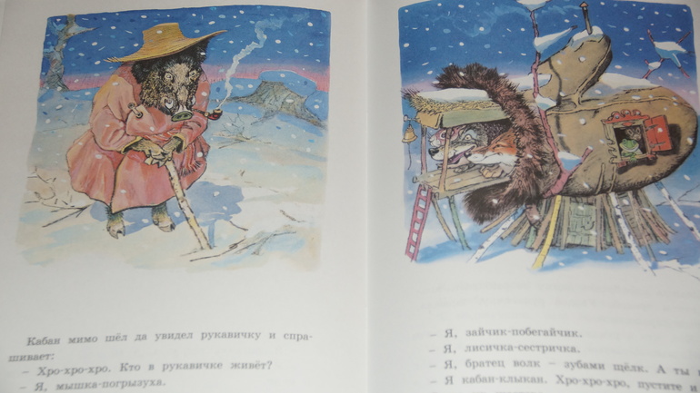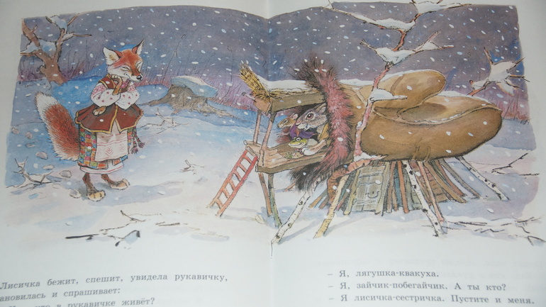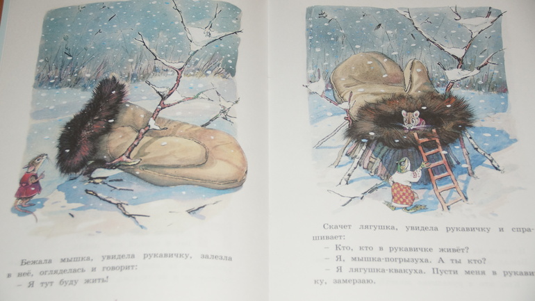 Сюжет "Рукавички", думаю, знаком всем. Мужик потерял в лесу рукавицу, в нее, как в русском народном "Теремке", даже герои в сказках одинаковые, за исключением кабана. Итак, набились звери в теплую рукавицу, а дед вспомнил про свою пропажу, послал вперед собаку, собака зверей распугала, дед подошел и забрал рукавицу. Вот так.