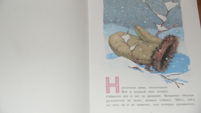 "Рукавичка" от "ИД Мещерякова" тонкая книжка, не маленького формата, страницы достаточно плотные. Печать хорошего качества. Кстати, картинки очень крупные, и текст довольно крупный. Бумага офсетная, без бликов, что мне доставляет большую радость.