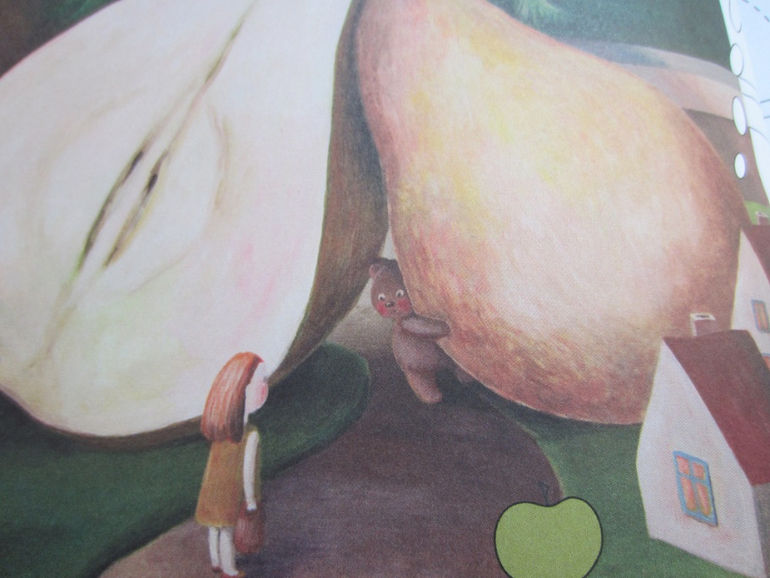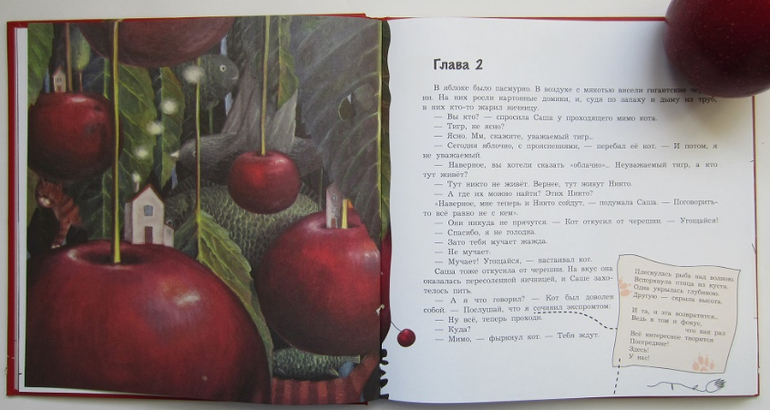 И тогда Саша решила сбежать. Но куда же? как раз кстати пришлась половинка яблока, а половинка - это уже не яблоко, это ябл! Потайной ход найден: Саша в Стране Гигантских Ябл. Там всё гигантское: и черешня, и груши, и арбузы, и клубника, и лук, и ромашки, и тюльпаны)
