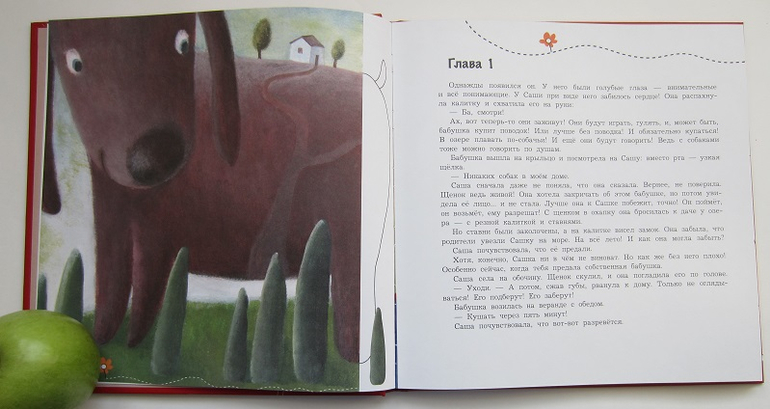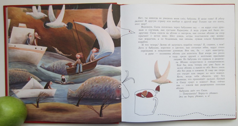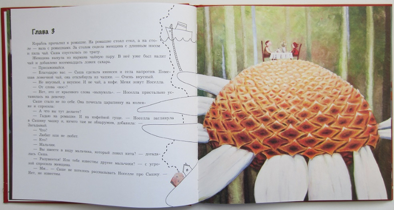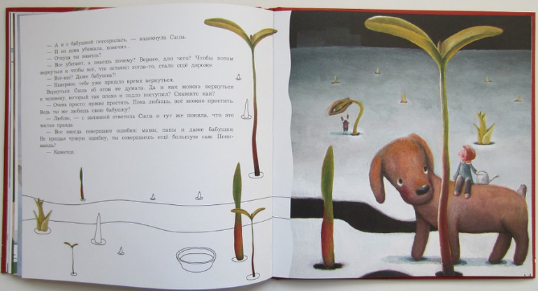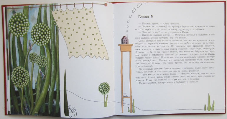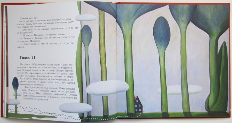 А какие же там вкусные облака! Саша много где побывает: и в мегаполисе из подснежных небоскрёбов, и в тюльпановых джунглях. Увидит сиреневых птицы и фиолетовых лошадей. Будет бежать за постоянно ускользающим мальчиком, так похожим на её друга.... И всё это время она будет переживать ситуацию с бабушкой и щенком! Она пишет записочки своей ба и сочиняет стихи, постепенно прогоняя из сердца обиду, убирая своё раздражение.