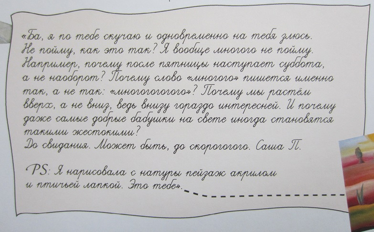"Ведь он (папа) всё время в командировках, а мама в своём бюро. Учить Сашу плавать им совсем некогда. Им даже некогда почитать ей книжку. Саша, конечно, сама умеет (научила ба), но иногда так хочется, чтобы кто-нибудь почитал тебе вслух. А ещё ба когда-то научила её выбирать спелую ягоду и брать правильный гриб. И слушать ручейки - раньше Саша их совсем не слышала. Плавать её тоже научила ба..."