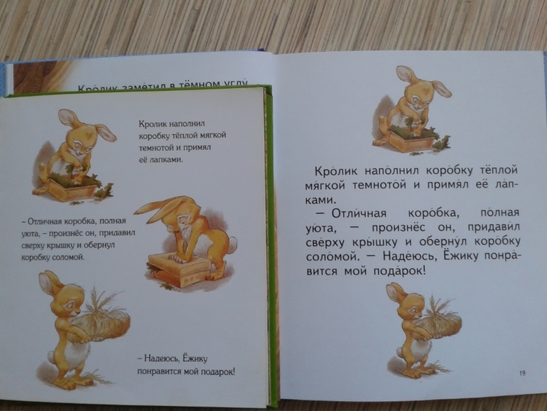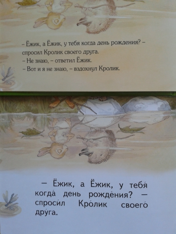 Местами иллюстрации затемнили даже слишком. Особенно это заметно вот в этой истории. Тут Ёжик и Кролик стоят около зеленоватой воды.