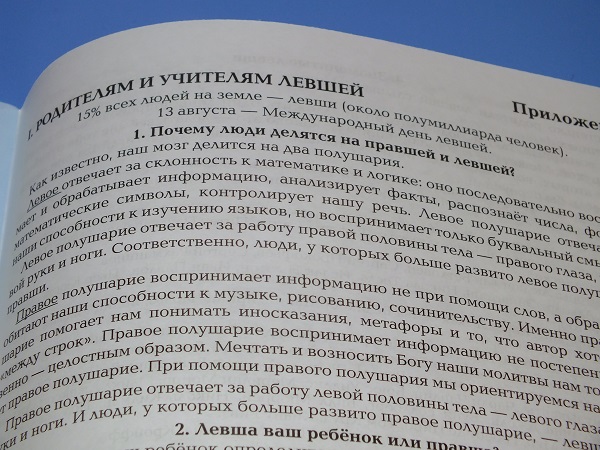 В конце много страниц отведено приложению (для родителей левшей), в котором рассказывается об особенностях леворуких детей, в том числе и схема мест в классе, наиболее удобных для левшей.