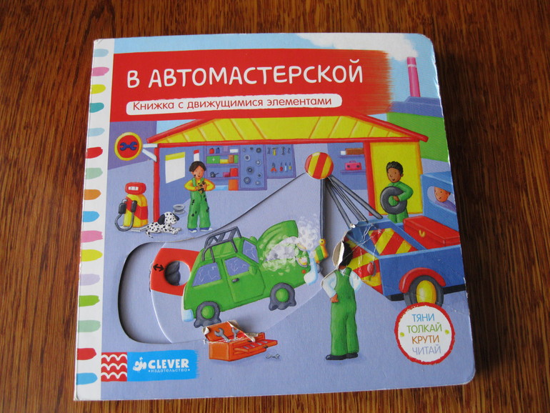 2. Книжка про автомастерскую от Клевера с движущимися элементами, местами пострадавшая от большой любви. Немножко покоробила меня количеством текста (2 строки на разворот), мой читатель уже был готов слушать больше. Пришлось использовать как книжку-картинку: показывать колеса, гаечные ключи и всё, что знала мама. Сейчас у ребенка вторая волна интереса к этой книге, научился крутить колесико и мыть машинку в автомойке, может рассматривать самостоятельно. О покупке не жалею, но больше ничего из этой серии решила не брать. Нам достаточно одной такой книги.