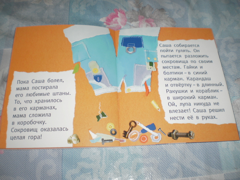 А в этой книжечке на двадцати с лишним страницах рассказывается о разных затеях мальчика Сашки, которому мама на день рождения подарила синие штанишки с кармашками. И в этих кармашках чего только у Сашки нет! И гвоздики, и гаечки, и карандаш, и отвертка, и веревочки, и даже паровозик с корабликом - все это нужно Сашке для разных игр, которые он придумывает на ходу. Придумывает очень много, только жаль, что все перечисляемые автором игры и затеи не очень стыкуются с названием - ведь для всех этих придумок Сашке понадобилась только одна вещь, которая хранилась в кармашке - веревочка, вернее, несколько веревочек, все остальные вышеперечисленные богатства в действе не участвовали и нигде ни разу не пригодились, во всяком случае по тексту. Так что автор вообще ни разу не Чехов, чьи заветы в этом произведении совершенно не выполняются - книга просто напичкана ружьями, которые так и не выстрелили.