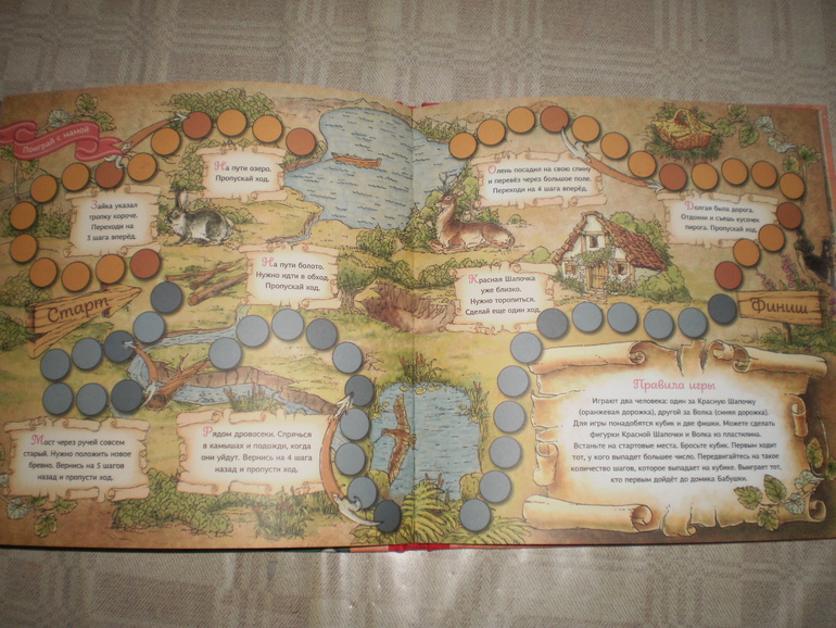Еще одна кровожадная сказка в нашем "рационе". Книга очень красивая, а потому понравилась всем без исключения. А уж как понравились окошечки в виде сердечек! И карта! И игра... Тёмка взвыл заканючил - давайте поиграем!!! Ну а какая там игра на шестерых-то - одно расстройство из-за ожидания своего хода да галдеж и ссоры по поводу цвета фишек.