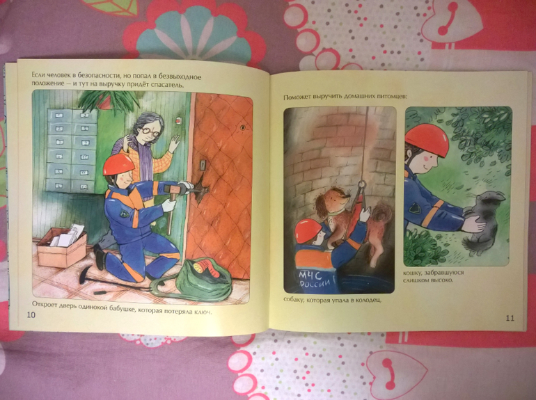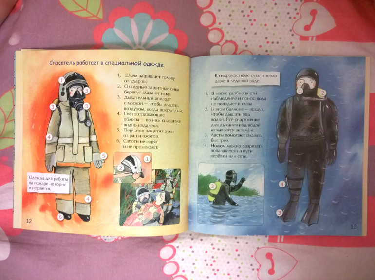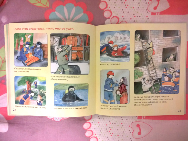 Большущее СПАСИБО издательству "Настя и Никита", выпустившему эту великолепную серию о профессиях. Уже продаются "Спасатель", "Художник", "Портной", "Пекарь", "Шофер", скоро выйдут "Доктор", "Астроном", "Учитель", "Пожарный", и обещаются многие другие. У нас почему-то особая любовь к спасателям, поэтому книга пришлась как нельзя кстати. Тут оочень много всего о спасателях, лично я и половины, как выяснилось, об их работе не знала) А Вера вообще слушает как зачарованная. Картинки:
