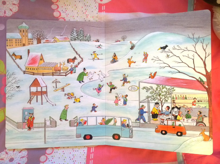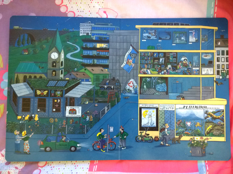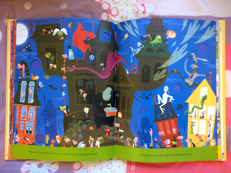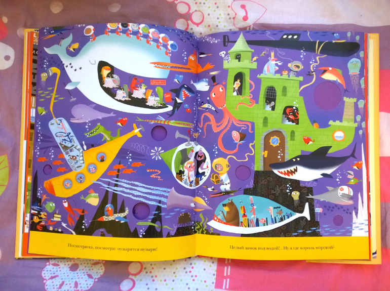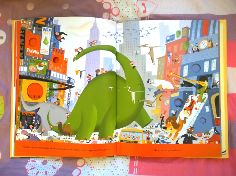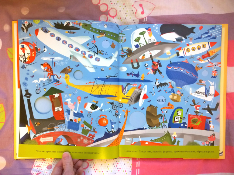 Честно скажу, до этой книги я просто смотреть не могла на такие иллюстрации. Ну выводит меня этот стиль изображения, как в дурацкий комиксах. Думаешь, неужели нельзя было по-человечески оформить детскую книгу!! Но тут - умываю руки - эти иллюстрации как нельзя кстати. Вся книга такая необыкновенная, прямо космическая, и обычные детские картинки тут так круто бы не смотрелись. Главная идея в том, чтобы найти персонажей/предметы из окошек на предыдущей странице. В общем, смотрите сами: