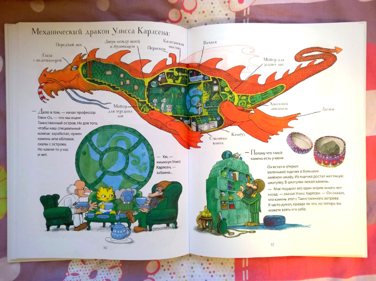 Механический дракон и грозные пираты, затерянный остров и выскочка-мэр, краснеющий как помидор - и вот уже наш папа, шевеля усами затаив дыхание, следит за продолжением истории. Ну, в общем, вы поняли, если бы не дочке, то себе мы бы ее точно купили:) Наша девочка в восторге, но еще больше советую ее мальчикам, лет до 5 увлечет точно.