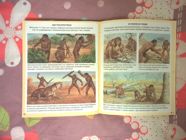 Замечательная, удивительная, страшно познавательная и супер реалистичная - все это о ней, о нашей любимице-энциклопедии. Я вообще с детства обожаю энциклопедии, могла чахнуть над ними часами) А тут недавно стала подыскивать подходящий вариант для дочки, когда ей было около трех.. и с сожалением поняла, что практически все энциклопедии для дошкольников страшно перегружены ненужными деталями, заумными фактами и почти лишены картинок:(( Купили мы парочку, полистали... скука и тоска смертная, вернулись к своим сказкам:) А потом случайно набрела на эту книгу, и - пропала. Во-первых, что в ней прекрасно - под одной обложкой объединено все, что касается доисторической эпохи - и древние люди, и динозавры, и другие животные. Во-вторых, как уже говорила, много-много картинок, почти на всю страницу, и - минимум текста, при этом - достаточно, чтобы заинтересовать и увлечь юного читателя. Ксати, что мне очень понравилось, при описании динозавров есть такие маленькие картиночки, на которых конкретный динозавр изображен рядом с человеком, чтобы наглядно показать разницу в величине: