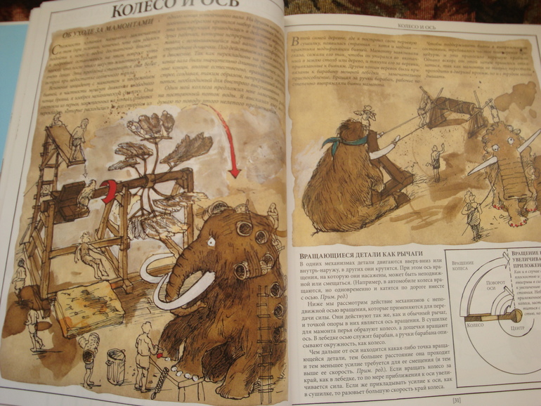В этом издании действительно описывается "как все устроено", начиная от рычага и кончая атомным реактором. А вы знаете как устроен холодильник? Термос? Замок? Не знаете? Так купите эту книгу))) Очень подробные картинки, специально для детей, которым нужно не только рассказать, о и показать, желательно в деталях. Очень повеселило что устройство многих механизмов показано на мамонтах, например на фото ниже сушат мамонту шерсть и выпрямляют бивни )))