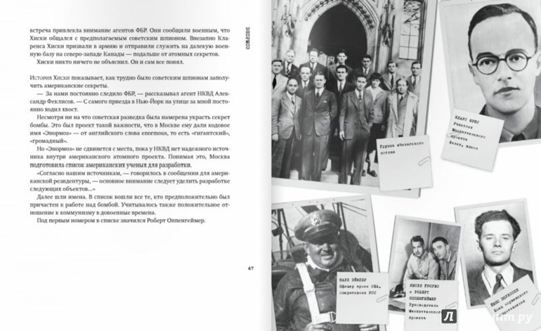 Скромный химик, бывший сотрудник Пенсильванской сахарной компании, завербованный советской разведкой, 16 лет вел двойную жизнь. Самый молодой ученый в Лос-Аламосе, симпатизирующий Советскому Союзу, и его сосед по общежитию, убежденный коммунист, передали секретную информацию по разработке атомного оружия в руки агентов советской разведки. В напряженной обстановке конца Второй мировой войны эти сведения оказались очень полезны советским ученым. Семь десятков лет отделяет нас от событий Второй мировой войны. Целая жизнь. Казалось бы, мир с тех пор невероятно изменился - телевидение, компьютеры, полеты в космос; при этом мы видим то же недоверие между странами, шпионские игры и войны. И почему-то все равно возвращаемся к той великой и страшной войне: читаем, пытаемся понять, разглядеть что-то важное для нас сегодняшних. История "Манхэттенского проекта" и создания атомной бомбы .