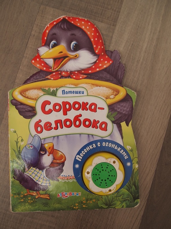 Месяца в 4 нам подарили книжку с песенкой от Азбукварик "Сорока-белобока". И это был следующий хит.