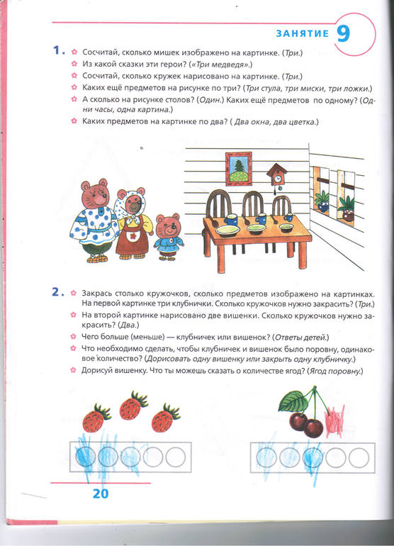 В общем, пособие мне понравилось. Там основные темы: счет и цифры до 5, времена года, части суток, геометрические фигуры, ориентация в пространстве (право-лево, верх-низ), противоположности (высокий-узкий, низкий-высокий и тд). Для нас из всего этого новым было только право-лево, ну то есть мы путали их, остальное все Лида уже знала. Но я все равно не пожалела, повторенье-мать ученья, я считаю, что главное не количество усвоенного материала, а качество. А вот такие задания, где нужно обвести, провести линию, дорисовать, раскрасить, как раз нам пришлись кстати - с этим нам еще работать и работать. Еще мне понравились такие задания, где, например, нужно раскрасить столько кружочков, сколько на картинке мишек. Это развивает и логику, и вообще полезно, тк я сама в школе работаю и знаю, как детям, особенно младшим школьникам, приходится объяснять смысл задания, самостоятельно они вообще его понять не могут, причем никто! даже отличники. Так что рекомендую эту книгу для детей с 3 лет, а сама обязательно буду покупать еще из этой серии. В книге 31 занятие, мы уже прошли половину. сначала был большой интерес, просила - мам, давай сделаем еще занятие! Потом надоело, интерес стал меньше, но все равно делаем, хоть и не каждый день. Там в серии еще 2 книги - счет до 5 (на 4 - 5 лет) и счет до 10 (на 5 - 6 лет), но мне кажется что возрастные рамки завышены.