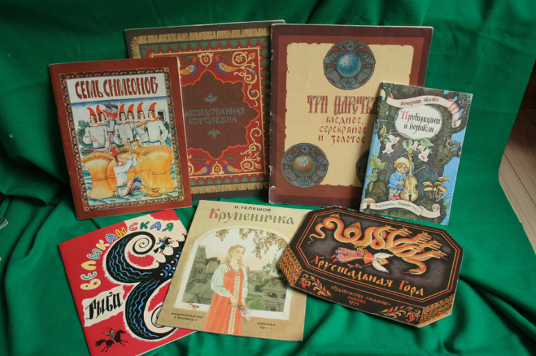 Книги в твердых обложках, сказки разных народов. (у нас их больше, но остальные в толстых букинистических переплетах и я часть из них показывала отдельно).