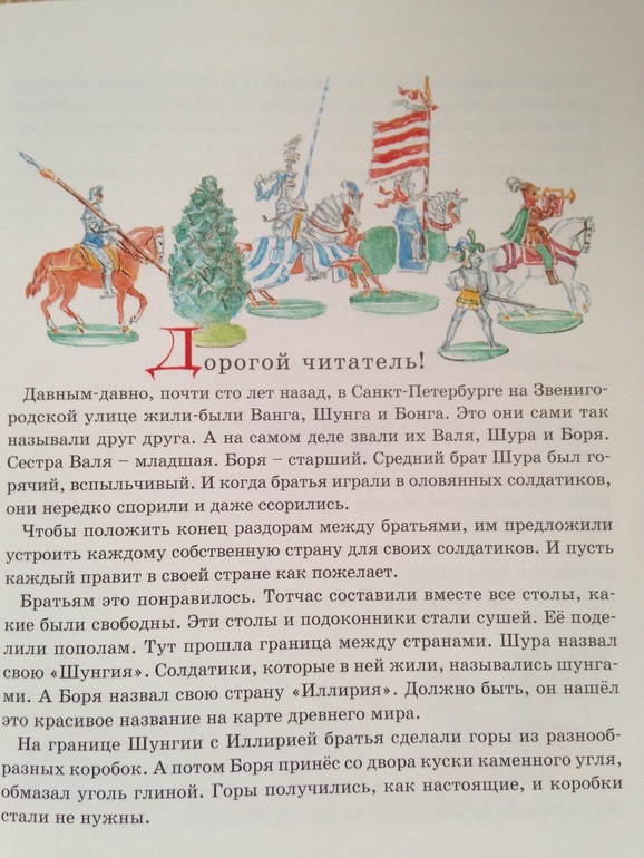 Первая -это собственно история семьи. Их было трое детей, два брата и сестра. В игре братья придумали свой мир, где было две страны " Шунгия" и " Иллирия". Маленькой сестре сделали " Веллию". Там были и горы из угля и глины, и гробница двух королей из сломанных солдатиков,и море на полу, в игрушечных пушках слелали дырочки, чтобы пулять по-настоящему, была железная дорога, перевозящая солдат в нужное место, были дома для мирных жителей. Все было хорошо, пока в 1917г не началась революция. Отцу Николаю Николаевичу пришлось выехать на юг, потому как он разводил лошадей, а в голодное время кормить их стало нечем. Но там лошадей конфисковали,отца назначили инструктором лошадей в Воронеже. В стране шла гражданская война. Белые решили разгромить тылы красных, грабили все на своем пути. Семье пришлось бежать, бросив вверенных лошадей. Пришла Советская власть. Поповы вернулись в Петербург. Старший сын Боря вырос, женился, и у него родился сын Рюрик-это и есть автор книги. Оставшиеся после переездов солдатики перешли в наследство ему, и пополнялась коллекция подаренными новыми по праздникам. Борю и деда Николая Николаевича орестовали в 1935 г. Деда выслали в Оренбург, но там опять орестовали, там он погиб. А спустя много лет бабушке дали справку, что погиб он без вины, что был честным человеком. Семью сослали в Сибирь, потому что они были образованнымм, просвещенными. Борис Николаевич стал работать в театре художником,добился успеха, жили хорошо. В 1940 переехали в Казань, в 1941 началась война с Германией. В 1943 отец Борис Николаевич умер,сестра Людаша тоже заболела и умерла, мать и сын Рюрик вернулись в Петербург вдвоем. Им выдали бумагу о невиновности, вернули доброе имя.Описаний войны нет, автор предлагает читать о ней в других книгах. Автор стал художником, как папа, и также как папа, любил и берег солдатиков. Он писал " Историю Иллирии", но немного стеснялся своего увлечения. Потом познакомился с музейным работником -полковником в отставке, и он коллекционировал солдатиков, и тот ему внушил, что стеснятся нечего.