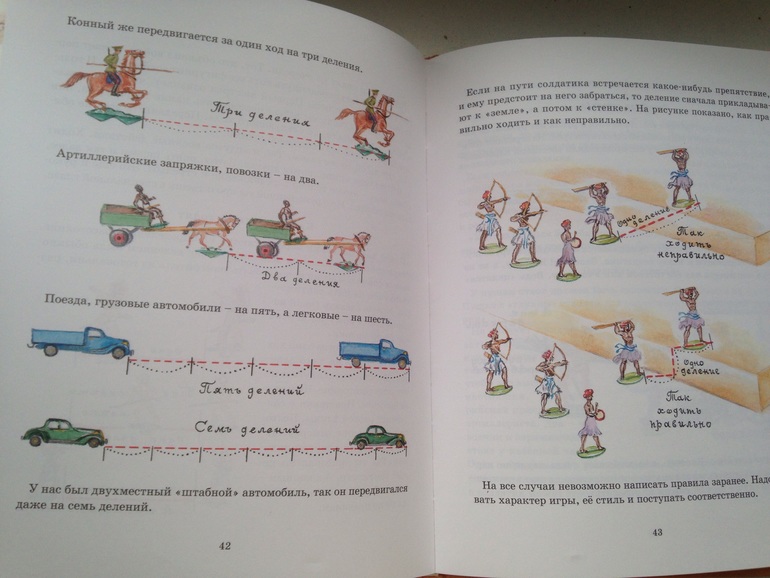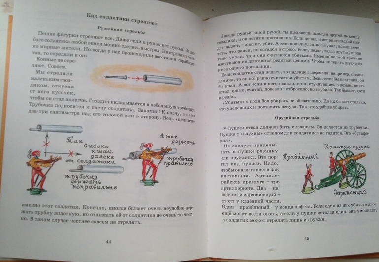 Также описаны способы стрельбы: ружейная и орудийная, рукопашная борьба.Пешие фигурки стрелять могут все, даже если фигурка без ружья- его мастерят из трубочки и гвоздика, прикладывая ровно по плечам солдатика. Если упал, значит убит, зацепил других-они тоже убиты. У пушки ствол должен быть сквозным, делается из трубочки, управляют три солдатика-два наводят дуло, один заряжает. Если нападает противник и хочет забрать пушку себе, ее можно взровать, чтоб не досталась врагу. Рукопашный бой играется с игральными кубиками- у кого больше точек выпало, тот победил. И еще много-много таких моментов, важных, но о которых и не подумал бы заранее.