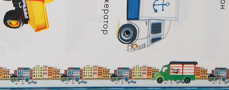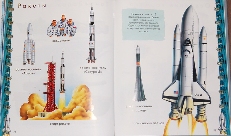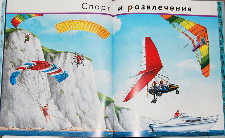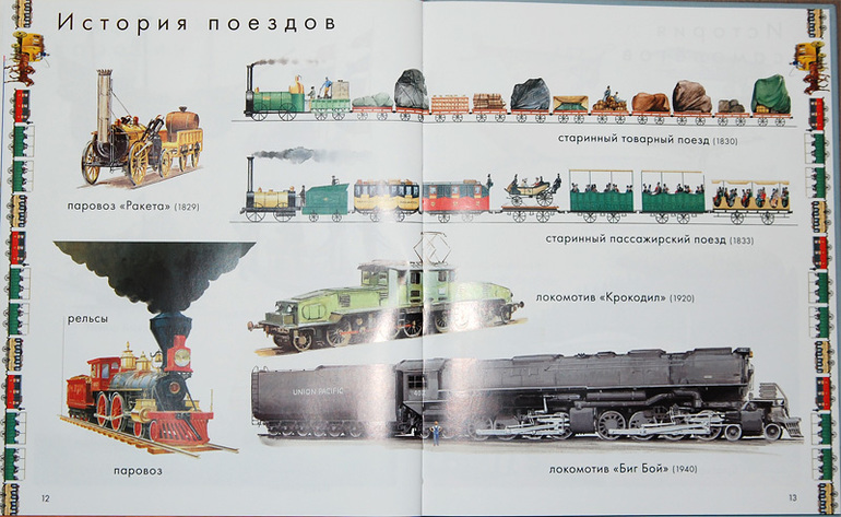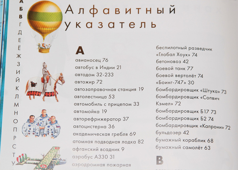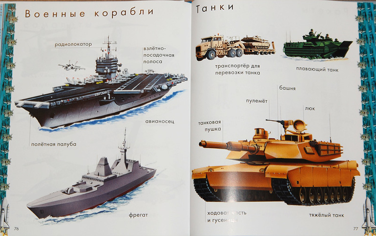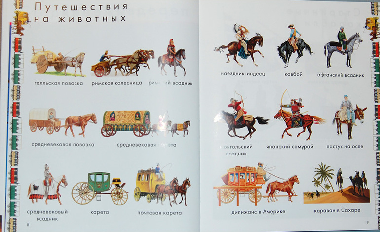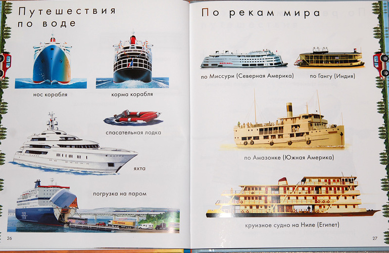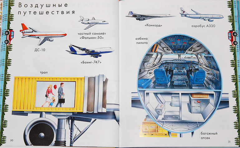 Текста здесь почти нет. Есть небольшое число вопросов на наблюдательность, не имеющих большей роли. В книге охватывается широкий спектр средств передвижения от пиратских галеонов до космических кораблей. Ориентирована на получение представления о видах транспорта для ребенка 2-5 лет. Здесь нет ничего лишнего, никакого избытка всех видов плав-средств или всевозможных моделей танков - а танки в этом сборнике тоже представлены. Это такой необходимый и достаточный минимум, который воспринимается без напряжения. Страницы украшены разнообразным тематическим орнаментом по краю. См примеры внизу. В конце книги алфавитный указатель транспортных средств.