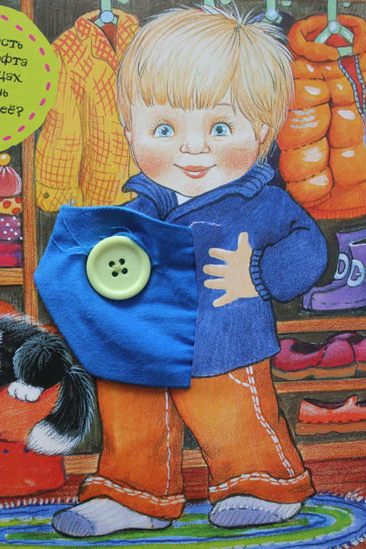 Книга с различными тактильными элементами для обучения ребенка первыми самостоятельными навыками в одевании.