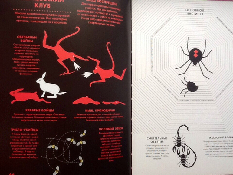 Вот названия глав: виды, органы чувств, рекордсмены, питание, семейная жизнь, среда обитания, невольные убийцы, друзья человека. Масса интересных фактов, как известных, так и не очень. Вот немного из содержания: «Бегемоты убивают больше людей, чем львы, леопарды или крокодилы.» «Обонятельная слизистая в носу бладхаунда в 76 раз обширнее, чем у человека. В ней 4 миллиарда реагирующих на запахи рецепторов, а у нас их всего 12 миллионов». «У медведя гризли чутье в семь раз лучше, чем у бладхаунда. Он улавливает запах добычи в радиусе 29 км и может почуять след животного спустя 48 часов после того, как оно прошло по земле.»