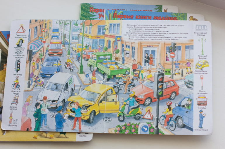 Ну и эта серия Первые книги малыша само собой. Мы с нее в принципе и начинали, в частности с книги Путешествие на автомобиле. После этой иллюстрации с аварией, у нас теперь правда любимая игра со столкновением транспорта и с возгласами всевозможными "бам, бубух, бабах, аваия". Но мальчишка, что поделать)