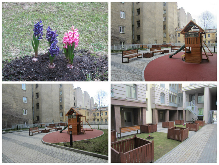 Пройдя через заветную калитку, я попала в дворик, практически двор-колодец, но на новый лад! Очень стильное, чудное место теперь у издательства! Я не объясню толком, но обойти помещение можно с четырёх сторон, увидеть детскую площадку, будущие клумбы и уже цветущие растения. Красота, чистота!