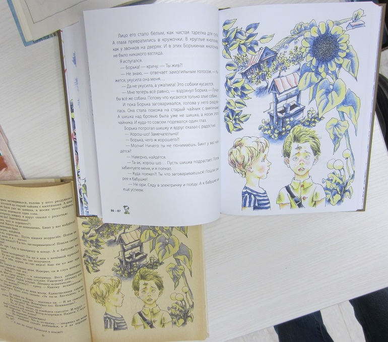 Михаил Бычков не просто художник этой книги, он ещё и дизайнер, участвовал в создании макета вместе со своей помощницей. Книгой Михаил доволен. Рассказывал, что привык видеть свои иллюстрации ещё в тех книжках, изданных давно (оригиналы были в папке, куда он уже и не заглядывал), и привык к тому, что его работы вот такие вот "серенькие", "блёклые"... А сейчас взглянул просто другими глазами. Даже на моей быстрой фотографии вы можете увидеть разницу: