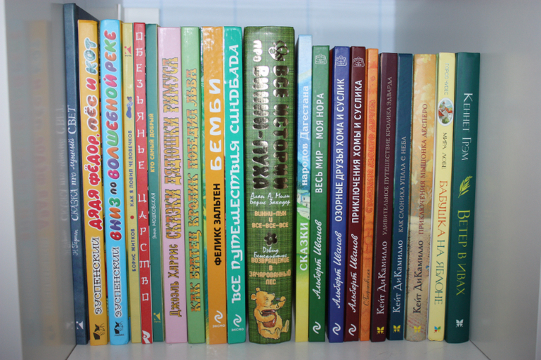 Здесь на полочках стоят самые часто читаемые книги и книги, которые ребёнок перерос, но по старой памяти иногда берёт в руки и пролистывает самостоятельно. Что-то читает (читает он пока только вслух, поэтому сразу понятно: действительно читает или просто картинки смотрит), а что-то просто проглядывает...