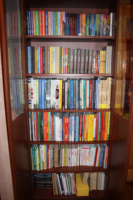 Честно говоря, мне не нравится как расставлены книги. Всё пытаюсь собраться с духом, разгрести все полки и расставить всё аккуратненько: по сериям, по росту... Но так уже привыкла к тому, где какая книга, что всё никак не решусь всё это разворошить... Так и стоят бедняжки вперемешку(((