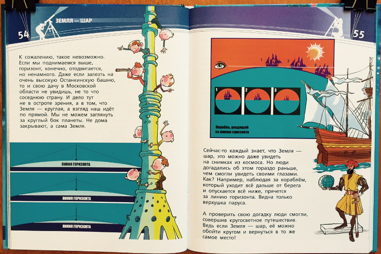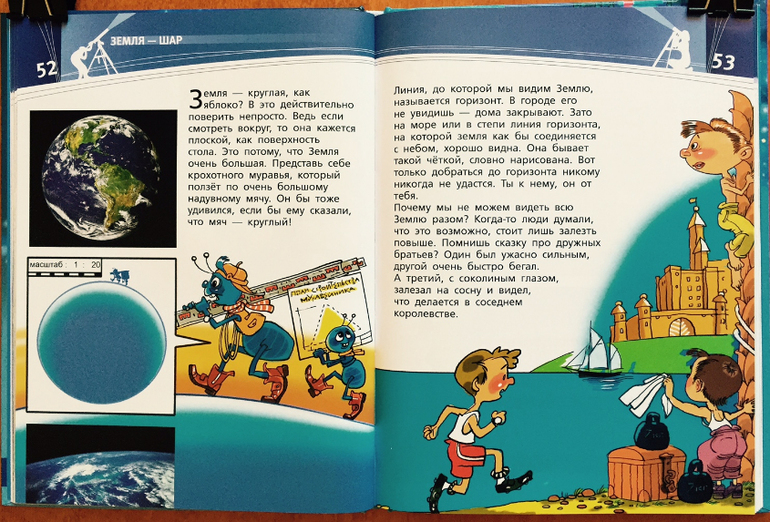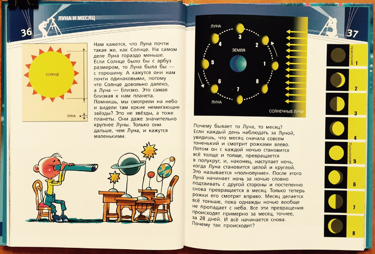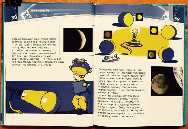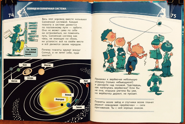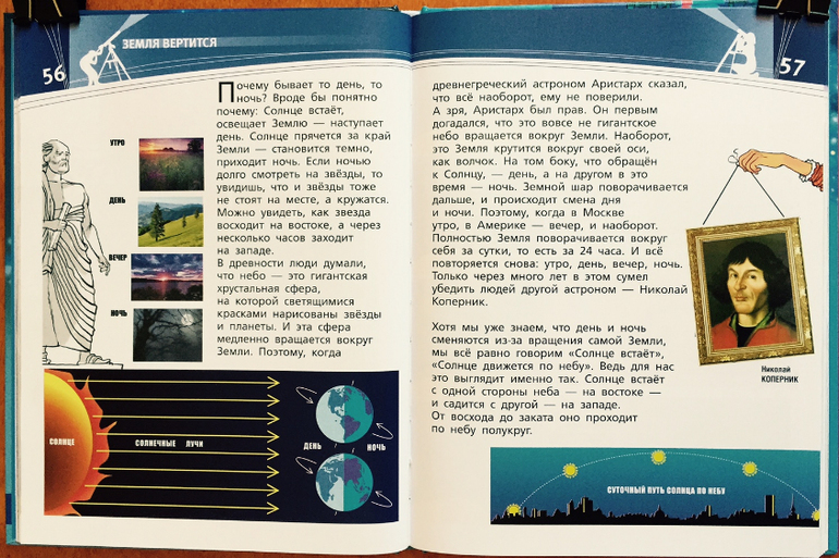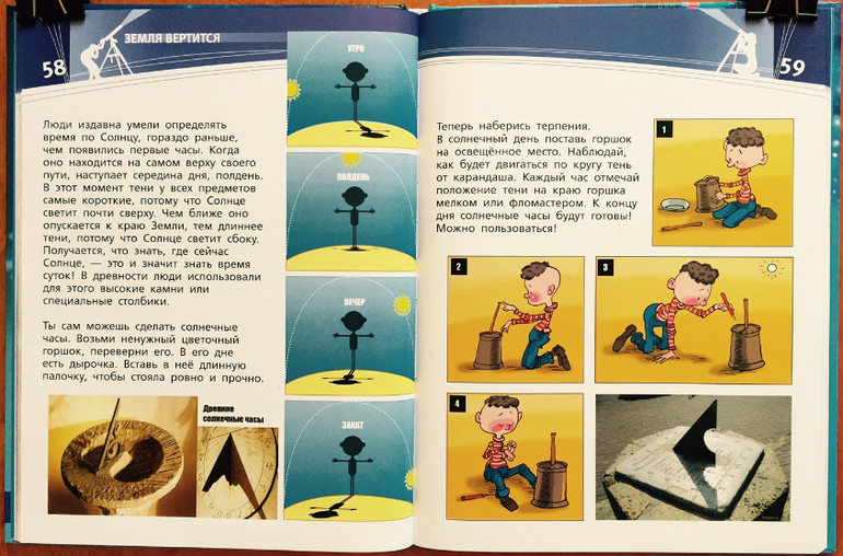 Наряду с этим детально описано, что представляет собой Солнце и какого оно размера, какова поверхность и температура Луны, что такое лунные "моря". Предлагается простой эксперимент для понимания, почему Луна "растет" и "тает". Далее рассказывается о линии горизонта, о том, кто первый в истории догадался, что Земля крутится вокруг своей оси, о первом кругосветном путешествии и о подтверждении теории, что Земля - круглая. О смене суток и об определении времени по солнечным часам. Оказывается, солнечные часы можно даже сделать самим из старого цветочного горшка!