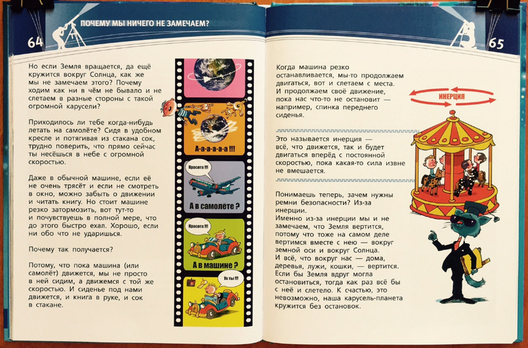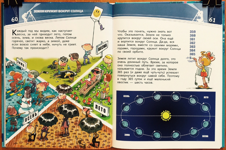 В главе "Земля кружит вокруг Солнца" объясняется, почему происходит смена времен года. Из этой главы дети узнают о наклоне земной оси и с помощью наглядных подробных рисунков запомнят, почему в разных полушариях в один момент времени - разное время года. Земля несется вокруг Солнца с бешеной скоростью. Но почему же мы ничего не замечаем? И на этот вопрос есть простой ответ! Все дело в инерции. Ведь когда ты летишь в самолете, ты тоже не замечаешь, как быстро он движется?.. А хочешь узнать о солнечных и лунных затмениях?