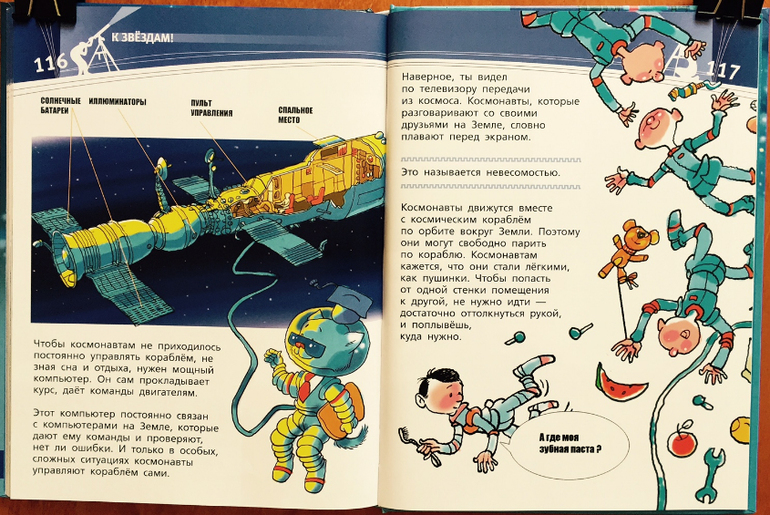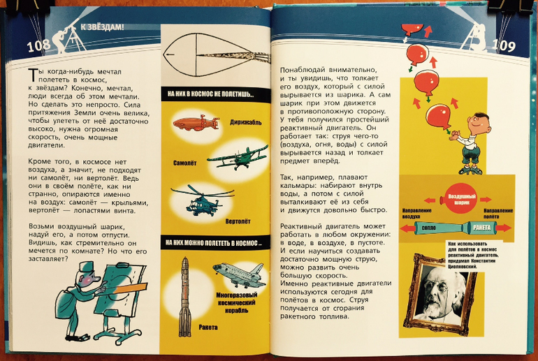 И в конце книги - об освоении космоса. О том, что такое реактивный двигатель,кто его придумал, как он работает. Простейший реактивный двигатель можно тоже сделать самому! Попробуй! О первом человеке в космосе, о регулярных полетах в космос, об условиях жизни и работе космонавтов на космических станциях, о невесомости и особой "космической" еде.