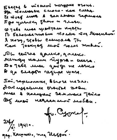 И лишь один жанр даёт мне прочуствовать всё. Я там, вместе с ними, я слышу, вижу и ощущаю жизнь и смерть вместе с ними. Этот жанр - стихи. Стихи, написанные на войне. Выделить один любимый трудно. Вот есть "Землянка" Алексея Суркова, есть "Жди меня" Константина Симонова, есть ещё море отчаянных и вселяющих надежду стихотворений, которые позволяют почуствовать войну... Пожалуй, для меня всё же "Землянка" ближе. Вообще-то у этого стихотворения нет названия, а называют его и "Землянка", и "В землянке", и "Печурка", и по первой строчке "Бьётся в тесной печурке огонь". Сразу всплывают перед глазами образы, слышится гармонь и тихий голос...