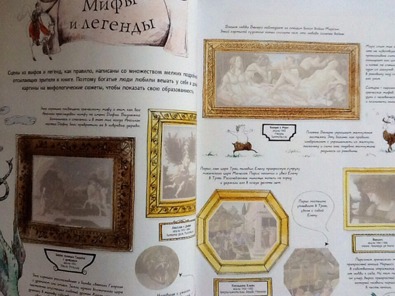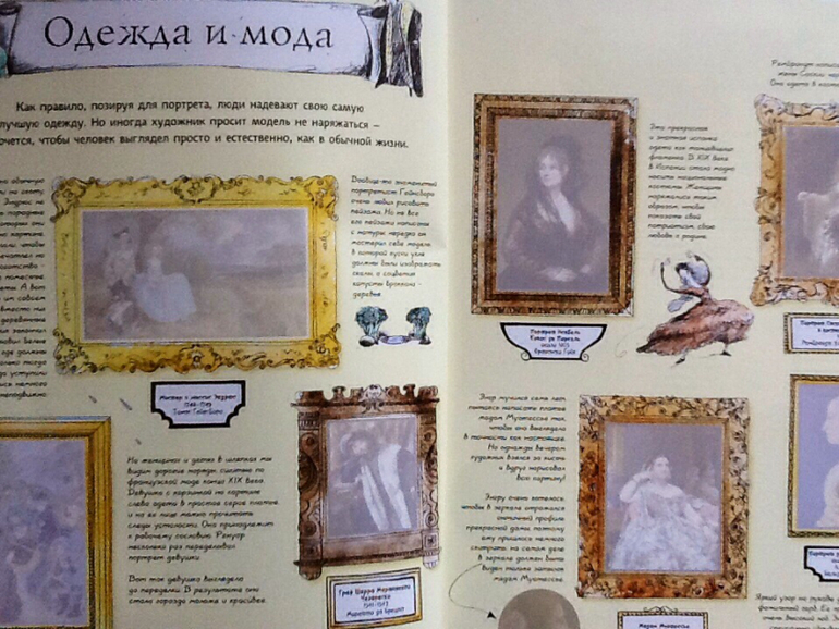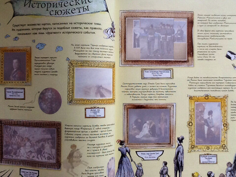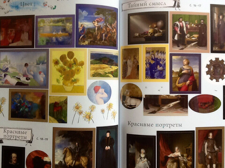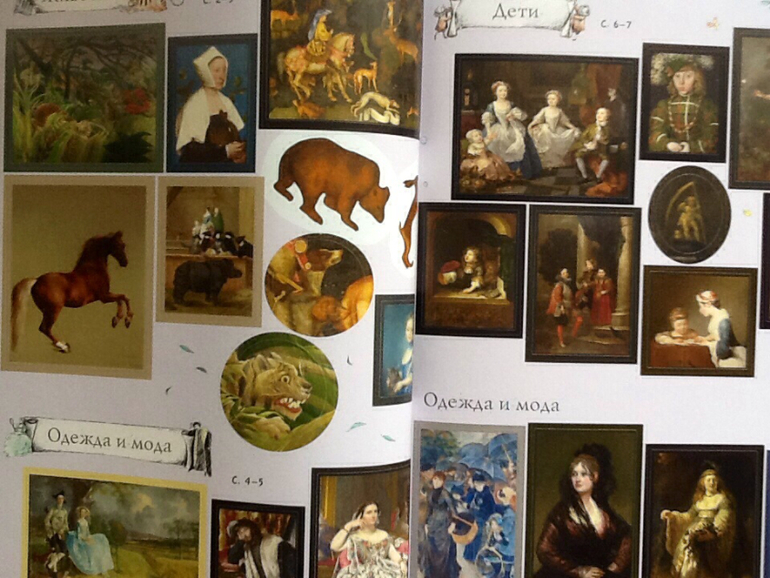 В альбоме представлены одни из лучших работ великих художников, таких как Леонардо да Винчи, Сандро Боттичелли, Клод Моне, Эдгар Дега, Эдуард Мане, Рафаэль, Тициан, Винсент Ван Гог и многих других. Альбом разбит на 15 разделов, один разворот - отдельная тема: животные, одежда и мода, дети, природа, жизнь города, свет, цвет, тайный смысл, красивые портреты, гротеск, автопортреты, развлечения, исторические сюжеты, мифы и легенды, ангелы и святые.
