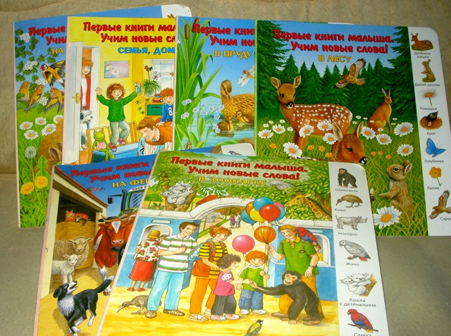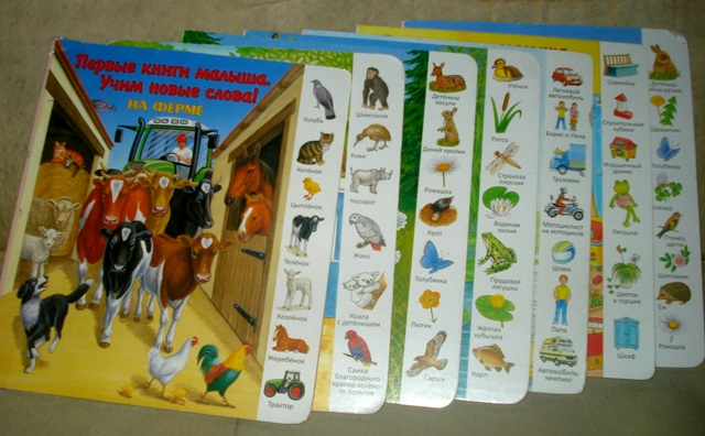10. "Первые книги малыша. Учим новые слова", Улыбка, 2013 (вся серия). Особенно любимы нами… да все, собственно! Меньший интерес, пожалуй, вызывают книжки "В лесу" и "На лугу и в поле". Но и они регулярно просматриваются, обсуждаются. В каждой книжке есть любимая страница, на которой ребёнок "виснет" минут на 10-15… Так в "Семье" это купание, в "Зоопарке" - шаловливые обезьянки, в "Путешествии на автомобиле" - авария… Увлекает ребёнка прослеживать действия одних и тех же героев на каждой страничке, например, собачки и кошки в "Семье"… Что удивительно, книжки очень и очень бюджетные (обошлись порядка 70 руб. за каждую - около 9 мес. назад), а сколько удовольствия)))