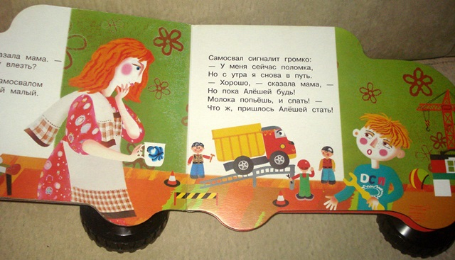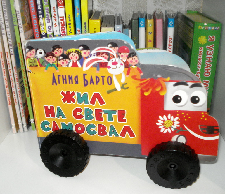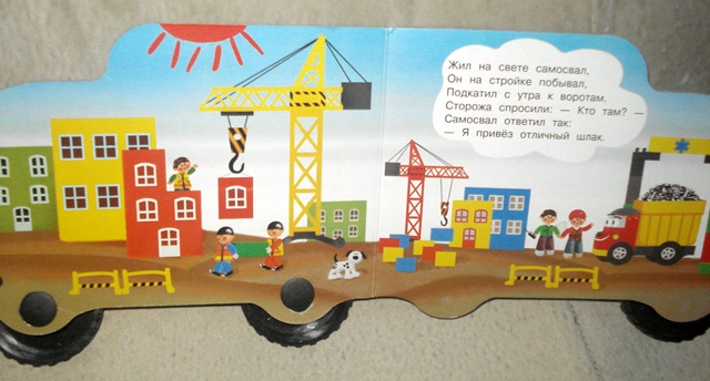 11. "Жил на свете самосвал" (Агния Барто), АСТ, 2014. Сейчас, наверное, реже Тёма ей играет, но в год-полтора - хит хитовый! Мальчишеская книжка-игрушка на колёсиках. Иллюстрации меня просто заворожили (сама не знаю почему?), может быть напоминают фигурки из Лего??? Спасибо художнику Э. Авакяну))) На пяти картонных разворотах - приключения маленького самосвала - рабочие будни, стройка, поломка и автосервис… и славный малый Алёша, хозяин машинки, который организовал все эти приключения. Стихи - без комментариев))) (я в детстве почему-то не знала этого стихотворения, хотя в доме есть несколько сборников А. Барто…) Чудесная книжка-игрушка для годовалых карапузов и чуть постарше. Мы с Тёмой рекомендуем!