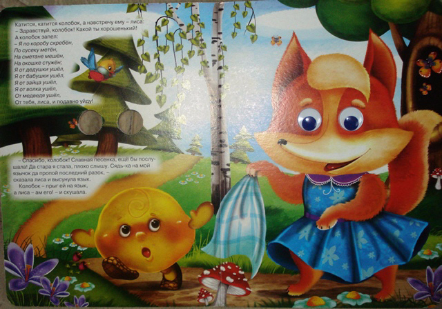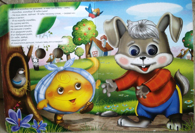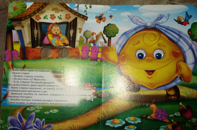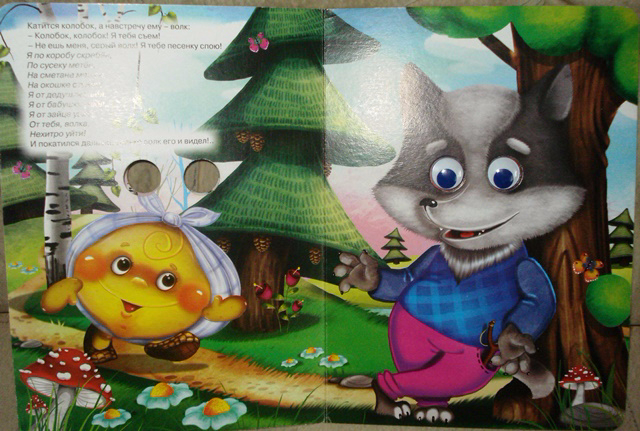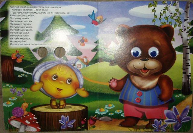 5. "Колобок", Проф-Пресс. Всегда напрягали картонные книжки с ГЛАЗКАМИ... страшненькие они какие-то... ну и эти компьютерные шаблонные иллюстрации... Но эта книга - наш безусловный хит месяцев с восьми... Тёме здесь нравится всё: и сама сказка, и забавный Колобок (с ГЛАЗКАМИ!), и милые с виду зверушки, мечтающие съесть Колобка, и пейзаж с ёлками, ну и, конечно, дырочки от ГЛАЗКОВ, в которые можно засовывать пальчики))) Я постепенно тоже полюбила эту книжку, есть какая-то объёмность в иллюстрациях - напоминает театральные декорации... Кстати, формат А4)))