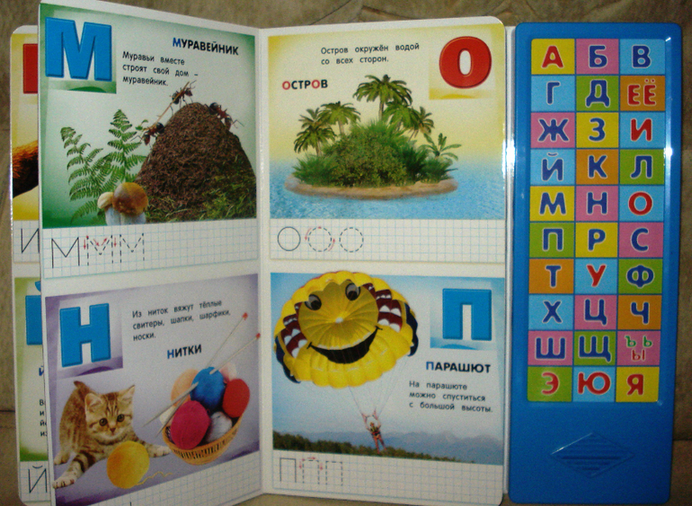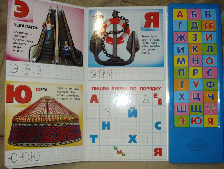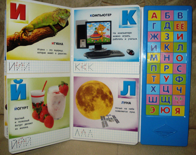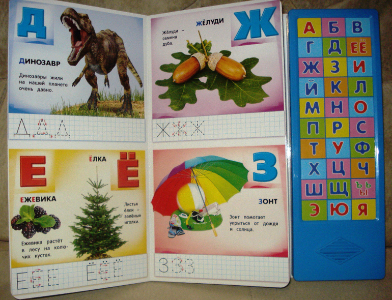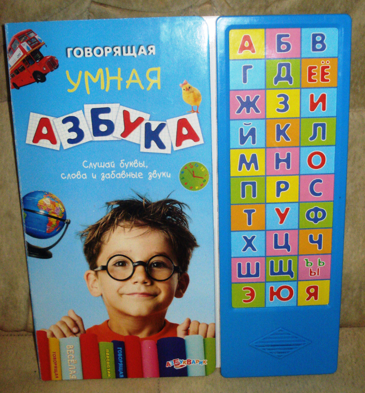 6. "Говорящая умная АЗБУКА", Азбукварик Групп. Куплена на распродаже в Детском мире за 190 руб. В течение первой недели вся семья по 100 раз в день слушала, как бибикает Автобус, как кто-то уплетает Йогурт и причмокивает, как на Острове резвятся папуасы, как пищит Цыплёнок и т.д. Удачные картинки, чёткие буквы, приятные звуки, можно прописывать буквы... Твёрдый картон, книга неубиваемая, батарейки дюжат уже 2 месяца... Оценка - 5+ (да ещё за такую цену))) Хит!