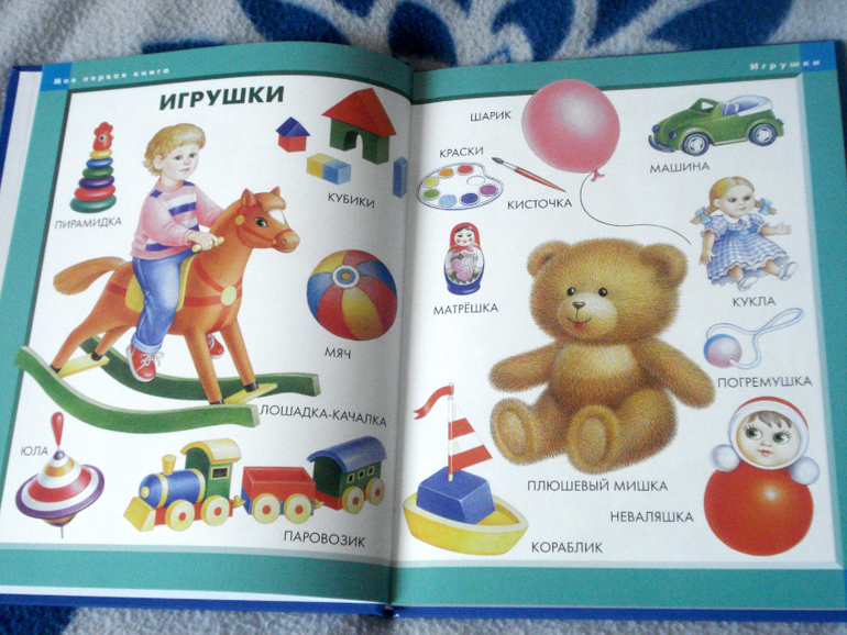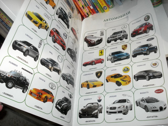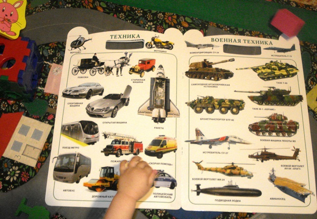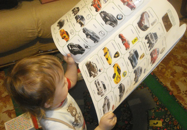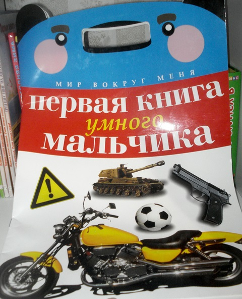 8. "Первая книга умного мальчика", Астрель. БОЛЬШАЯ книга (формат А3). Всего 4 листа с красочными, яркими иллюстрациями: марки автомобилей, техника, оружие, дорожные знаки. Над автомобилями Тёма "зависает" бывает подолгу... Книга-игрушка, гляделка, коврик для игр с машинками, "сумочка" (есть две ручки для удобства переноски)... Страницы плотные, покрытые плёнкой, около года уже книга выдерживает нешуточную любовь маленького мальчика... Купила её нехотя, хотела другую из этой серии, но была только такая. Думала, что книга будет разовым развлечением, но она оказалась функциональнее - мы с ней играем, расставляем машинки, раскладывает карточки с марками машин и дорожными знаками по принципу лото…