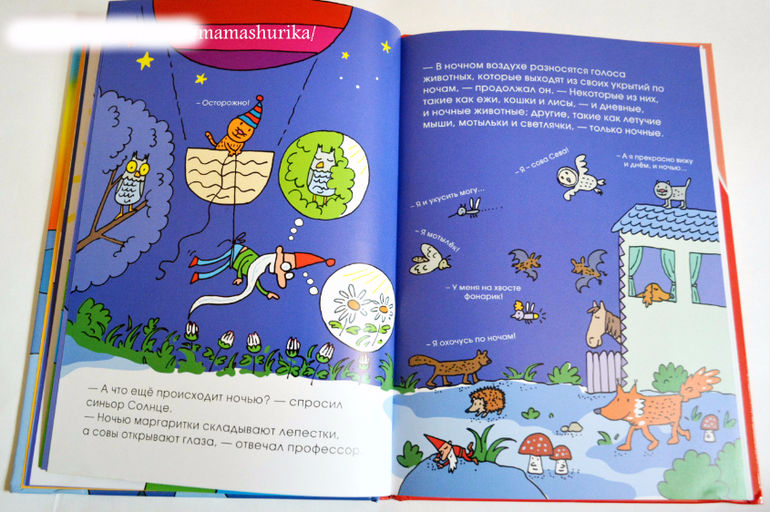 Так вот, в этой книге "Солнце надевает пижаму" как вероятно Вы уже сумели догадаться, речь пойдёт о смене дня и ночи . Тут уже не синьор капелька выступает в роли главного героя (хотя в книге он присутствует на многих рисунках и ребёнку несомненно, будет интересно его там отыскать), а профессор Молния и его кот Икар, они решают выяснить куда прячется солнце, они облетят планету и узнают (и конечно расскажут нам) много интересного и про смену дня и ночи и про то почему не стоит боятся темноты, о том какие животные не спят по ночам и живут ночной жизнью и многое другое.