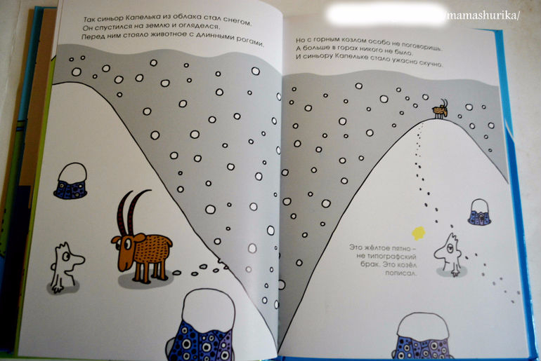 Круговорот воды в природе показан и рассказан в виде довольно интересной и не банальной истории , синьор капелька путешествует, вначале он станет облачком, превратится в снег, станет рекой, в итоге окажется в водопроводе и станет... мятным напитком (!) Всё так легко, увлекательно!